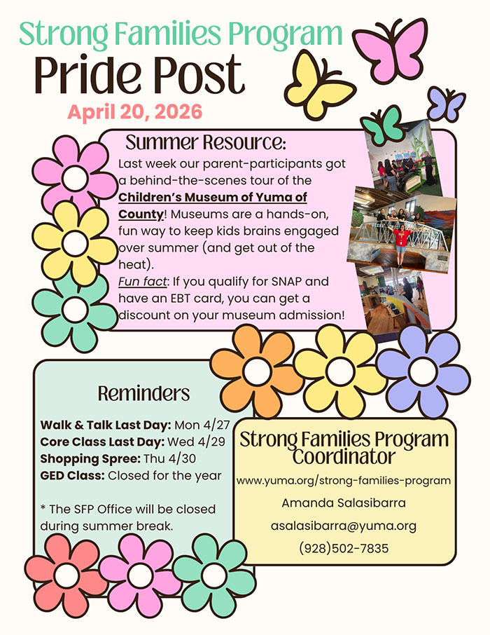The goal of the SFP is to improve students’ academic skills by strengthening the family as a whole unit. This program empowers families to reach their goals and teaches skills you can use to become the strongest family unit you have ever been. (And we have some fun along the way!)